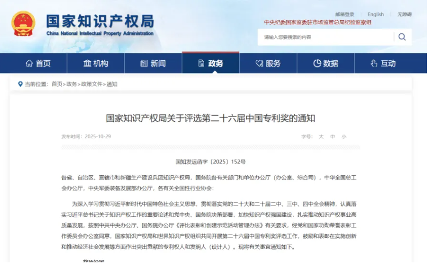 2025-10-30 / 来源:《中国知识产权报》 / 阅读量:国家知识产权局10月29日发布通知显示,国家知识产权局和世界知识产权组织共同开展第二十六届中国专利奖评选工作,鼓励和表彰在实施创新和推动经济社会发展等方面作出突出贡献的专利权人和发明人(设计人)。本届中国专利奖设中国专利金奖、银奖、优秀奖,中国外观设计金奖、银奖、优秀奖等奖项。