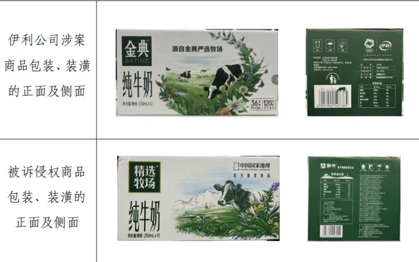 对于伊利公司的起诉,蒙牛公司认为,绿色、矩形的外包装设计,一侧“商标+品名+规格”、另一侧为插画的版式设计,牧场和奶牛元素的设计元素均属于牛奶领域常见的设计方式。伊利公司主张的包装、装潢不具有商业标识意义上的显著性。蒙牛公司自身“精选牧场”品牌经营已超十年,其包装装潢系自有设计延续,不构成不正当竞争。